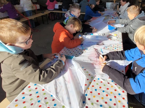 Bei strahlendem Sonnenschein und leichtem Wind machte sich die Naschulische Betreuung aus Sehnde/Ilten heute Morgen auf den Weg zum Klein Bolzumer Weg, um die begrünte Kalirückstandshalde von Friedrichshall zu erkunden. Nach der Ankunft stand jedoch zunächst ein Besuch in einer Halle auf dem Recyclinggelände auf dem Programm. Hier erwartete die Kinder eine spannende Überraschung: ein fliegender Drache, den es kreativ zu gestalten galt. Voller Begeisterung konnten die Kinder ihrer Fantasie freien Lauf lassen und die Drachen nach Herzenslust bemalen.